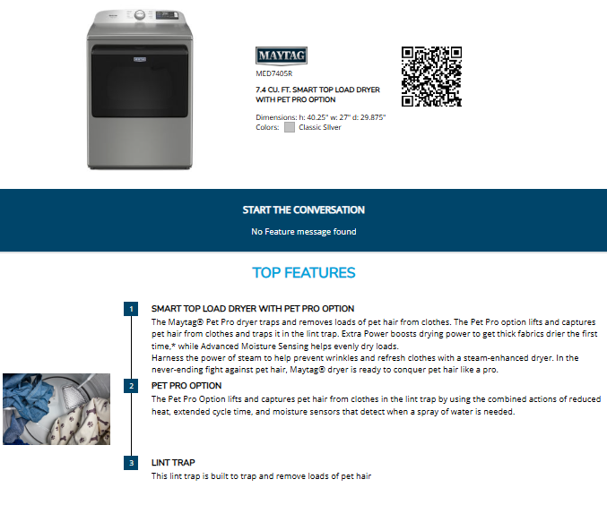 The Maytag Smart Top Load Dryer with Pet Pro Option (MED7405RR) is built for pet owners, featuring a dedicated Pet Pro cycle that lifts and traps pet hair in an oversized lint screen. Smart connectivity, Extra Power, and Advanced Moisture Sensing ensure even, efficient drying for large loads, keeping clothes clean, fresh, and pet-hair free.