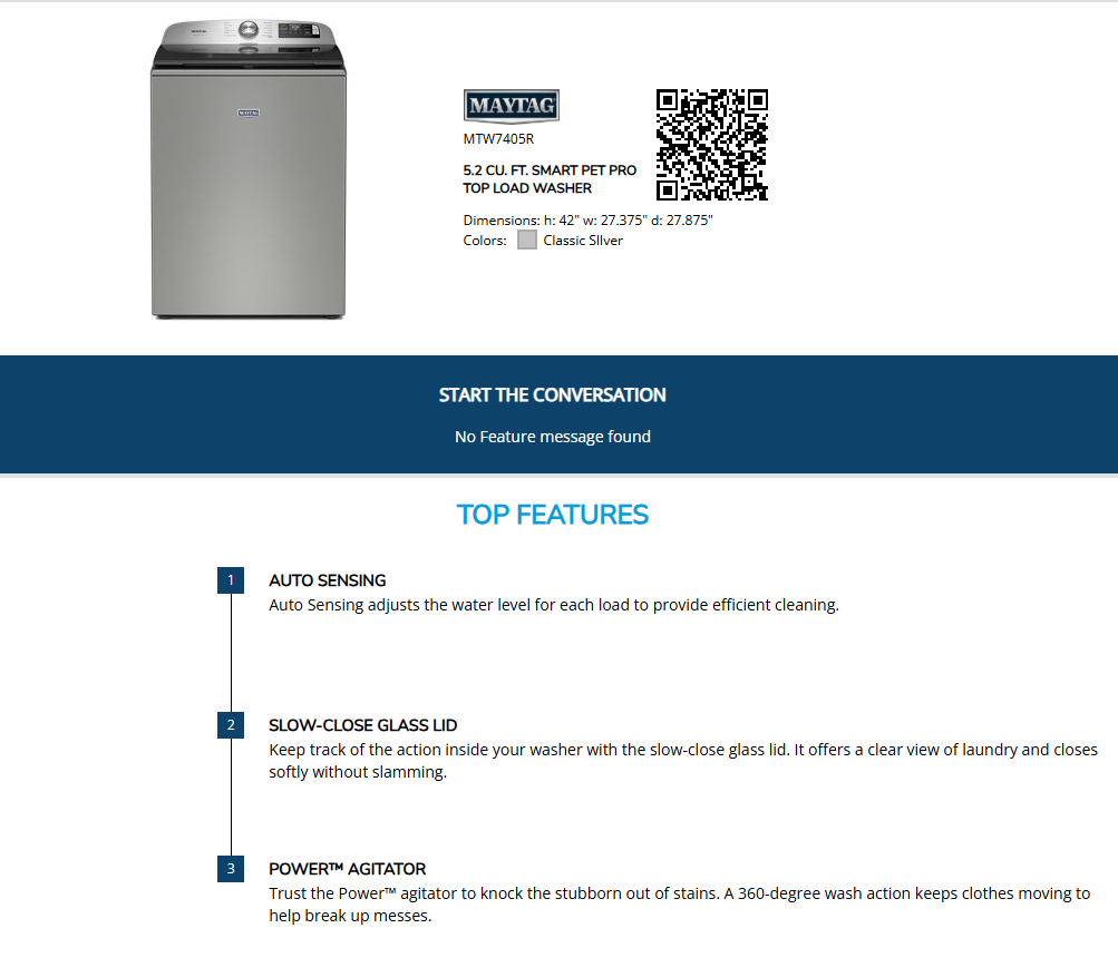 The Maytag MTW7405R is a 4.3 cu. ft. top‑load washer built for reliable, everyday performance. It features the Power™ agitator to help remove tough stains, an Extra Power option for added cleaning strength, and a Deep Fill setting to customize water levels. With straightforward controls, a durable stainless‑steel wash basket, and a 10‑year limited parts warranty, the MTW7405R delivers dependable cleaning and convenience for busy households.